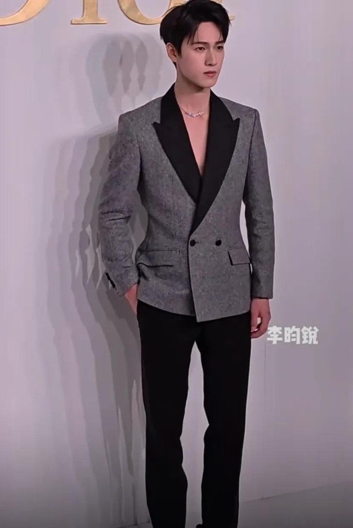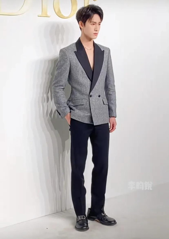 李昀锐灰色西装外套,真空上阵格外性感,衣服还挺合身的,就是这个鞋尺码也太大了吧,走路估计都不跟脚。