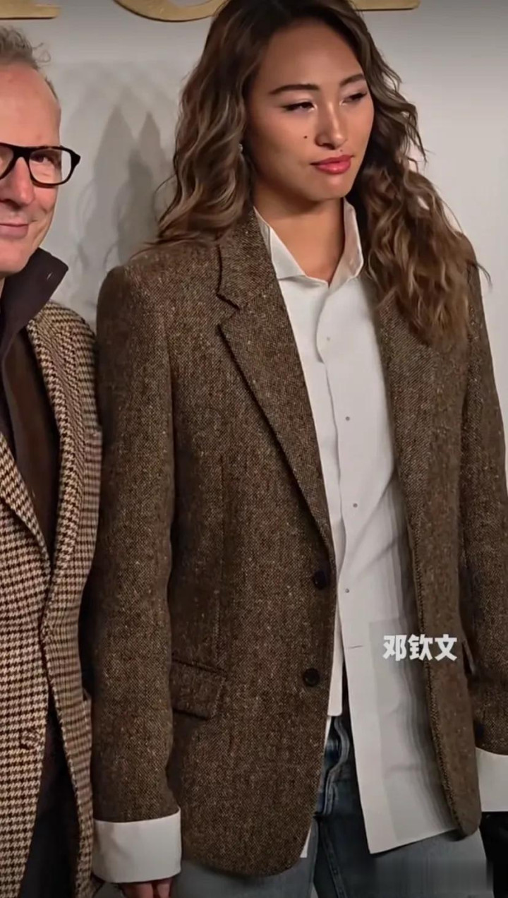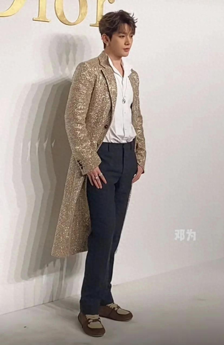 邓为身穿香槟金色长款外套,搭配白色衬衫和西装裤,一头棕发的他五官立体精致,犹如贵公子一般十分帅气。