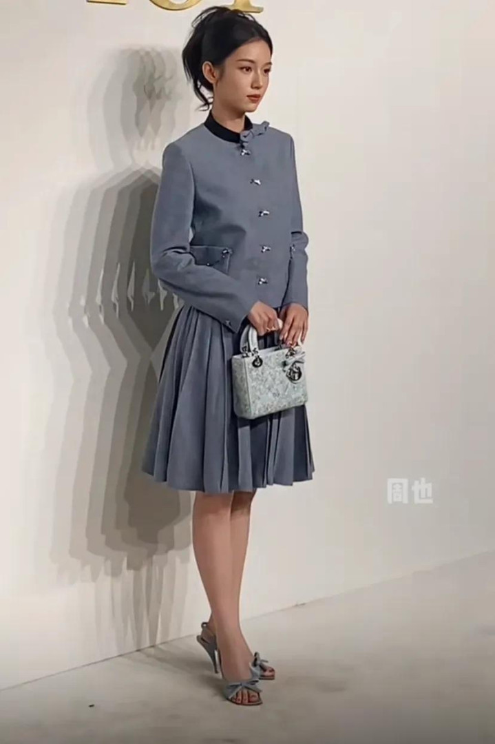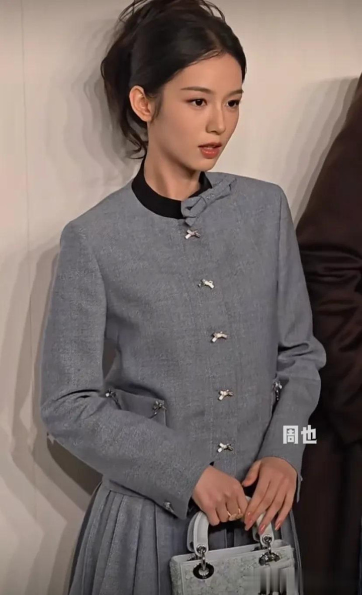 周也身穿灰色小香风套装,搭配同色系鞋子,拎着戴妃包包,完全就是富家千金的既视感。
