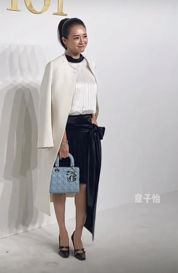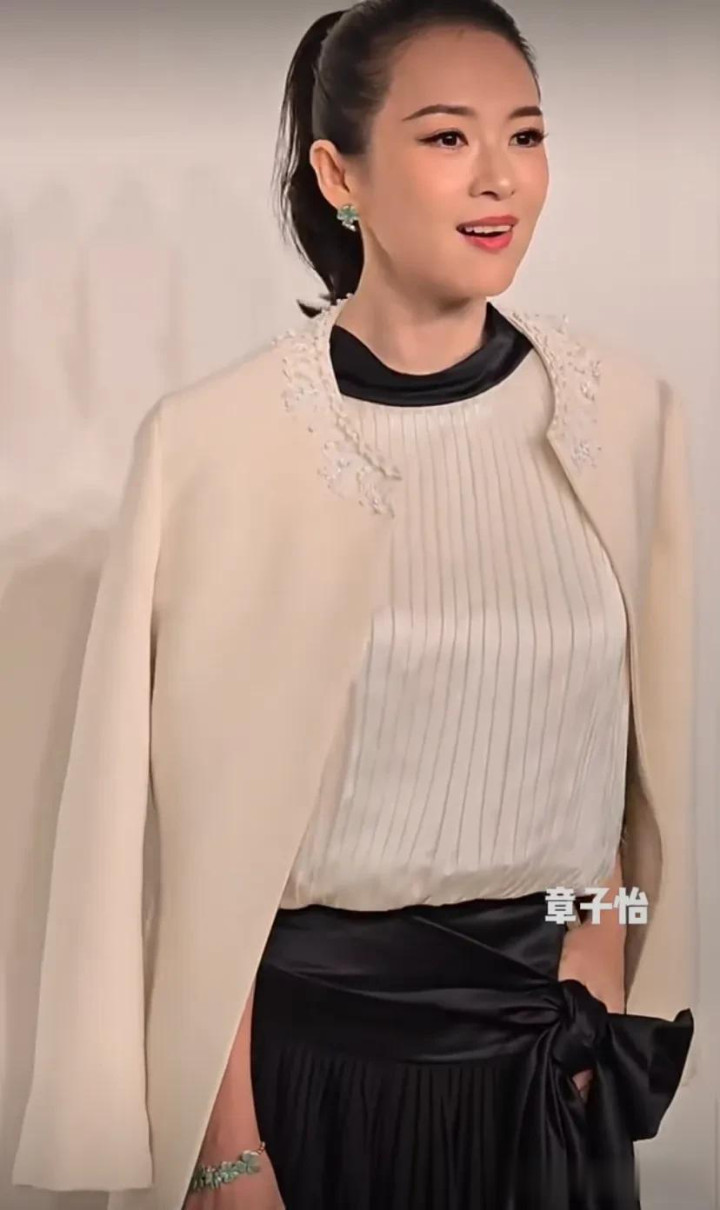 章子怡梳着大背头高马尾,穿着白色西装外套,搭配黑色半裙,她这套衣服有点欣赏不来,不是很适合她,所以显得她也不怎么出挑。