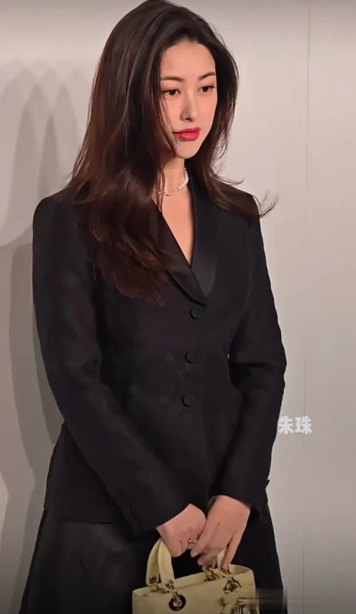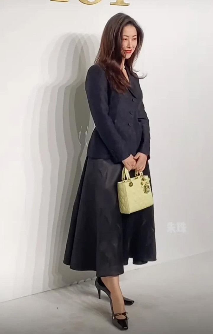 朱珠黑色外套搭配黑色半裙,拿着黄色小包包,披散着头发,笑起来梨涡明显,实在是貌美。